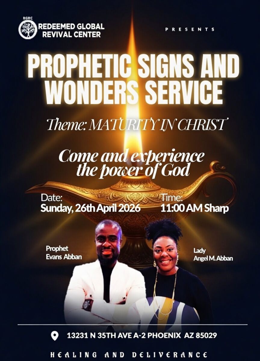 « THE FERVENT PRAYER OF THE RIGHTEOUS PROPHETIC SIGNS AND WONDERS SERVICE April 20, 2026 By RGRC 0 Comment 18 Views Tags: Ministry + Google Calendar+ iCal Export Details Date: April 26 Time: 11:00 am - 2:00 pm Event Category:Ministry Organizer Redeemed Global Revival Center